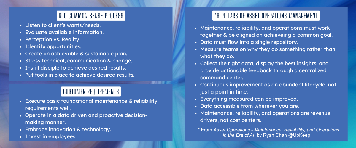 Common Sense Reliability - What is CSR? It is the model developed and used at RPC. It consists of three sections – RPC Common Sense Process; Customer Requirements; and 8 Pillars of Asset Management (From Asset Operations – Maintenance, Reliability, and Operations in the Era of AI by Ryan Chan @ UpKeep). RPC Common Sense Processes are the steps we follow in most customer projects. The steps are: