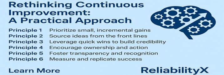 The ultimate goal is to note improvement each operation, shift, and day. Continuous improvement opportunities should be implemented and built upon. ReliabilityX has defined a great approach with six principles, stating: “Meaningful progress is attainable through a few core principles, paired with consistent execution. These principles are not revolutionary, but they are powerful when applied with intention. Here are several that can help drive real improvement within your organization:” This is a great take on this fundamental concept. Well done to the ReliabilityX team!